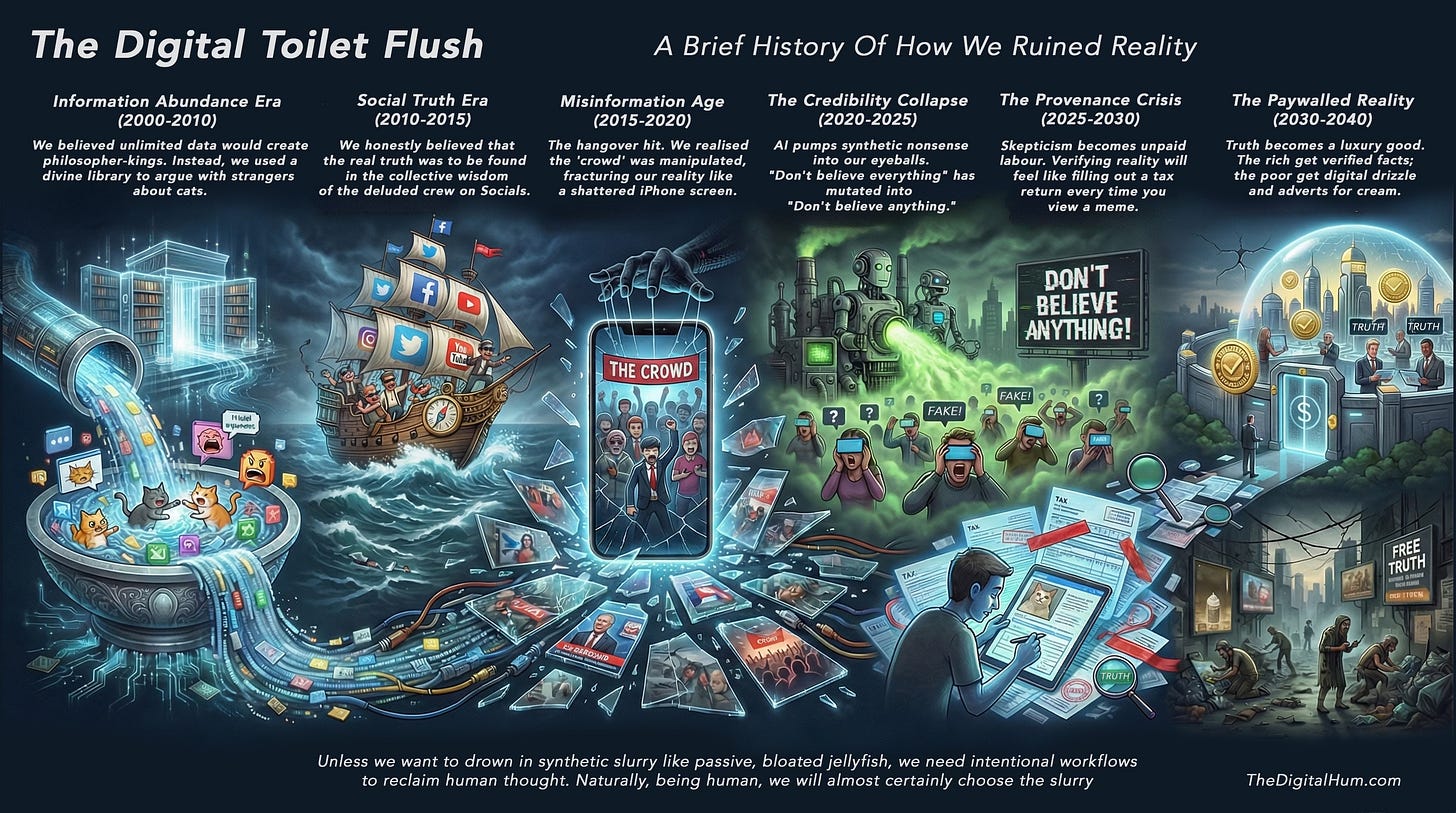Which brings us to the current sewage pipe we are swimming in: “The Credibility Collapse” (2020-2025). Thanks to generative AI, deepfakes, and chatbots that hallucinate with the confidence of a mediocre Oxford graduate, we have reached the nadir. The old adage “Don’t believe everything you see online” has mutated into a nihilistic screech of “Don’t believe anything, ever, even if your own mother is holding it up in front of your face.”