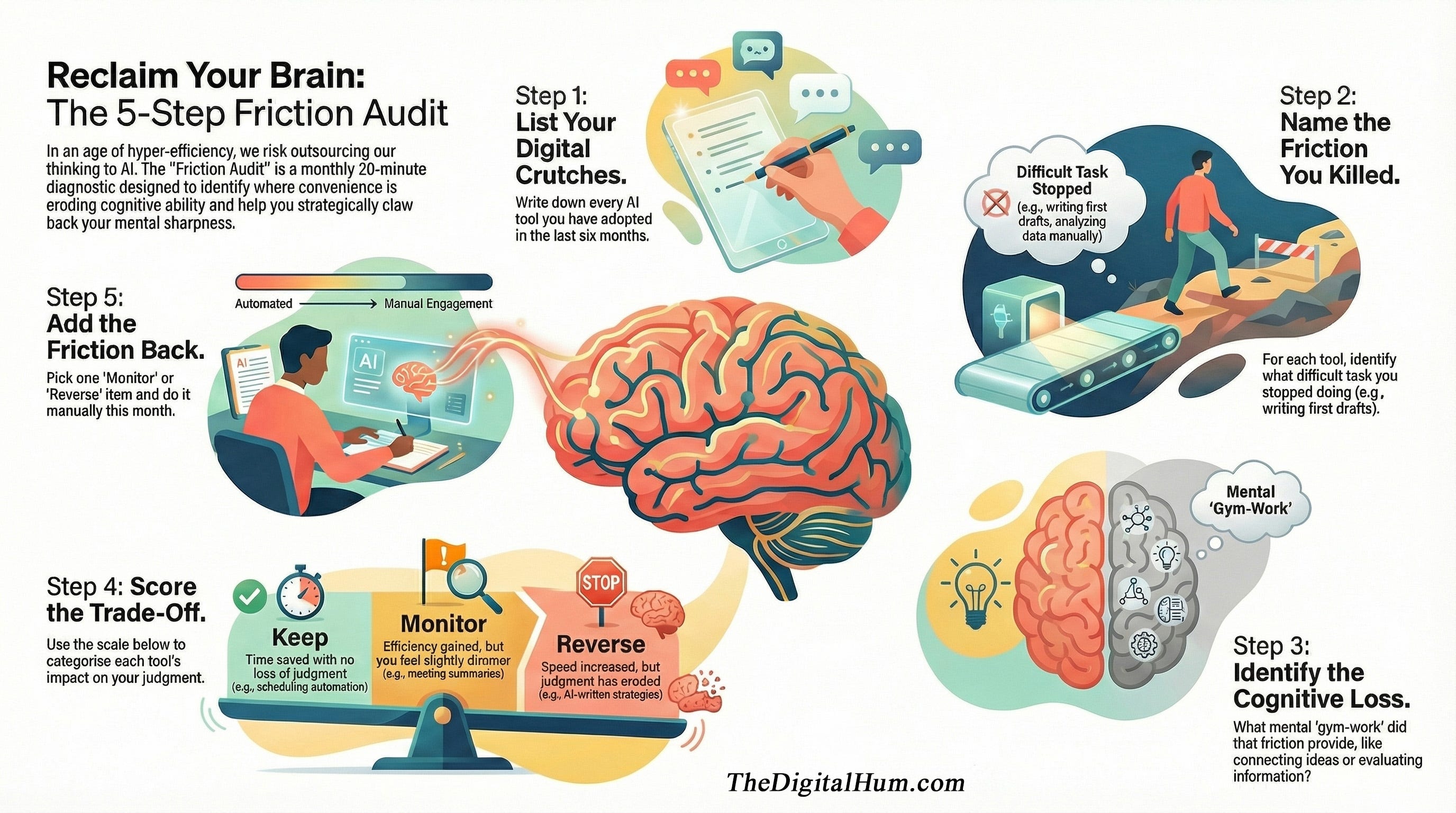 Pick one “Monitor” or “Reverse” item and add the friction back. Read the full memo. Write the email yourself, typing every painful letter with your own human fingers. Do the research manually.